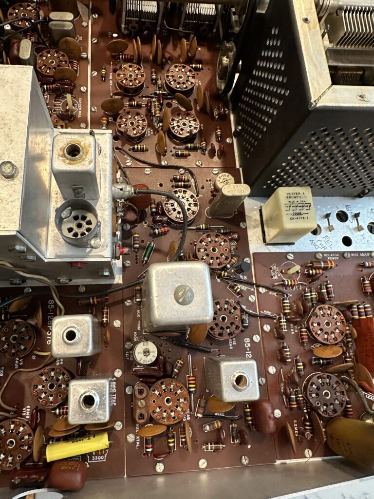 So I’m waiting for a crystal, some resistors, a coil, and a bag of capacitors. Rather than chase down problems that those parts will or might fix, I decided it was time for a bath. I removed all of the tubes and tagged them with their locations using masking tape on the side of each tube. Then I gave the top side of the circuit boards a liberal spray of Dawn Powerwash and gently scrubbed everything I could with a small paintbrush and an acid brush, trying to loosen any dirt, grime, and oil from the boards. I gave it a thorough spray rinse from the faucet and repeated the process. Then it was into the oven on the “warm” setting, about 125-150 degrees, for an hour to thoroughly and quickly dry everything off. I opened the oven door a couple of times to let the moist air out and let fresh, dry air in. Then I turned the oven off and let the rig sit in there to cool slowly.