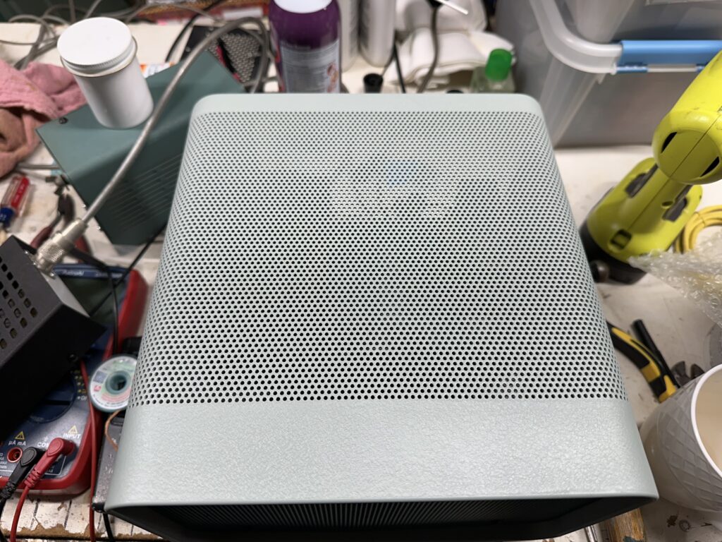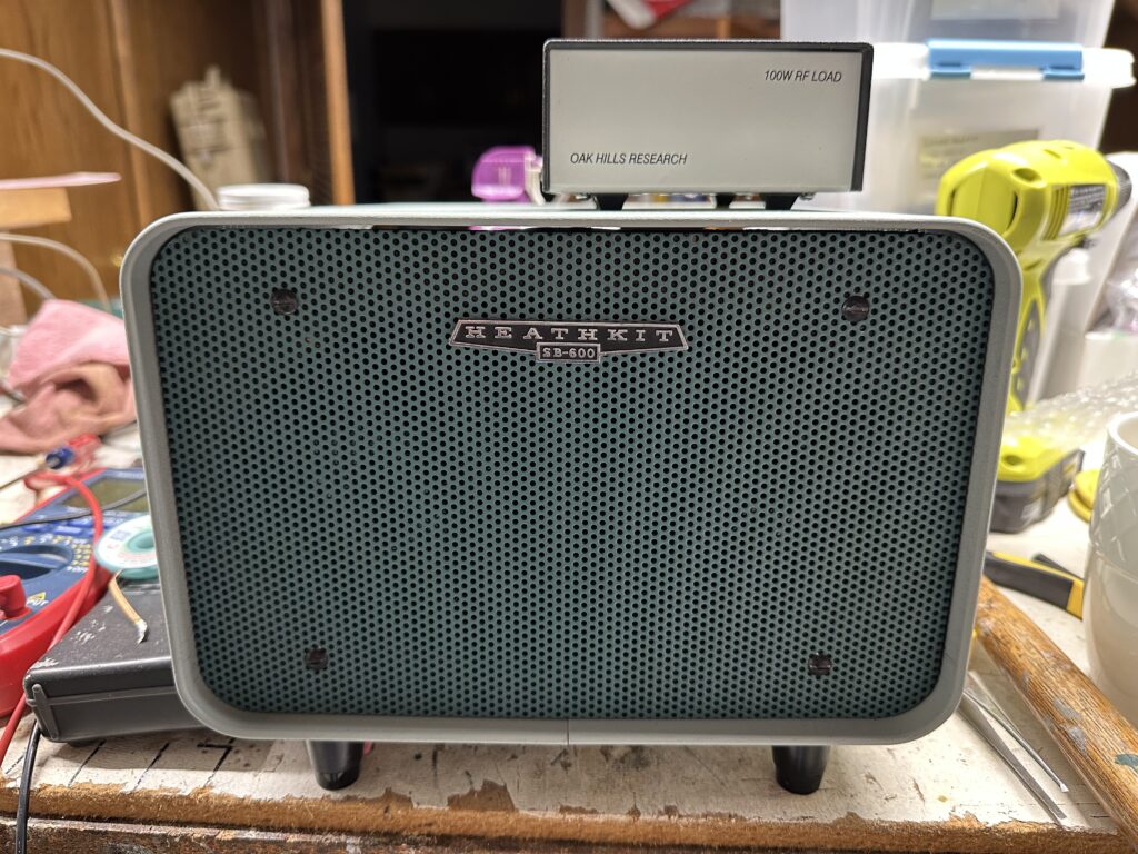 With the paint done, all that remained was to get it all put back together with the new speaker and the power supply mounted in the back. The HW-series paint is a darker, more turquoise green that is a nice match for the speaker grille on the SB-600. I mainly bought that paint to see if it’s the right color to turn my HG-10 VFO into an HG-10B so it matches my HW-16 transceiver (it is and it did), but it matches the SB-600 grille so well I went ahead and shot a coat on that as well. That takes care of the places where the four black screws for the speaker had taken the paint off when they were installed.
